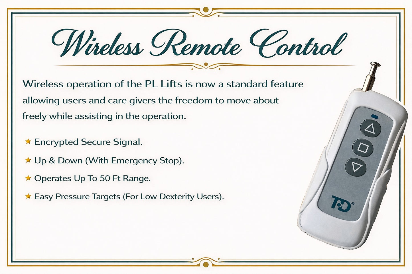 The PL-52 is equipped with clearly labeled, platform-mounted controls designed for everyday use. Multiple up and down buttons provide larger target areas, making operation easier and more intuitive for users.
